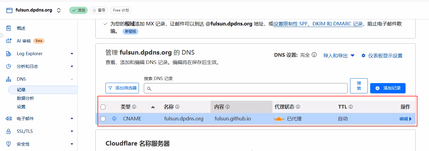 DNS → 添加记录 → 类型 CNAME,名称 @,目标 fulsun.github.io(GitHub 强制要求),代理状态(橙色云图标)✅