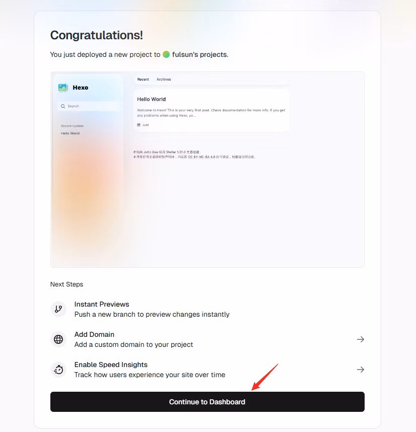 成功部署后的页面如下,点击 Go to Dashboard,即可前往该项目的控制面板。