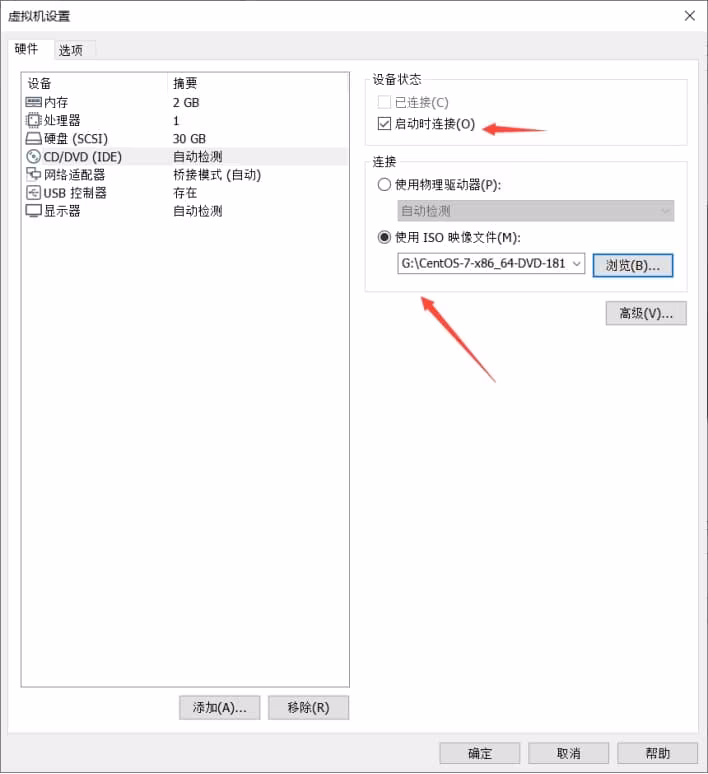 先选择CD/DVD,再选择使用ISO映像文件,最后选择浏览找到下载好的镜像文件。启动时连接一定要勾选上后确定